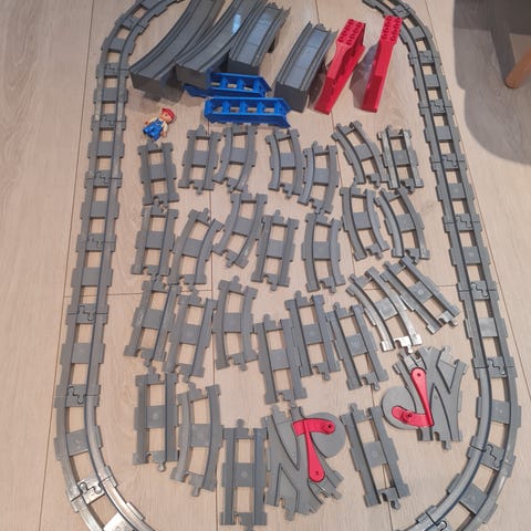 5 kg Lego Duplo: 2 meter togskinne med bro, tog, biler, figurer og klosser.
