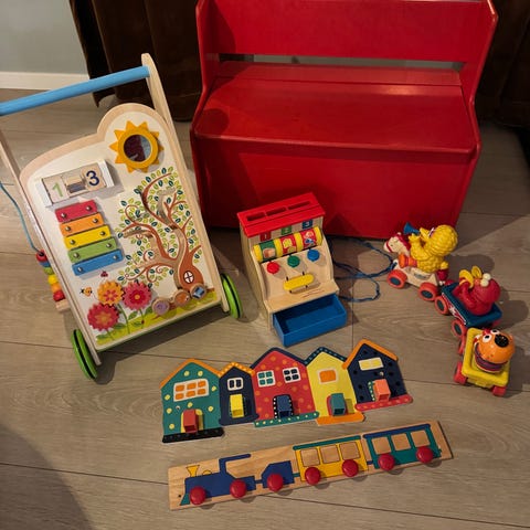 Puslespill, bøker, klosser, tog ++ selges samlet.