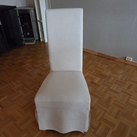 Noe flekker på stoffer på noen av stolene(se bilde). Noe bruksmerker på stolben. Seks stoler selges samlet.