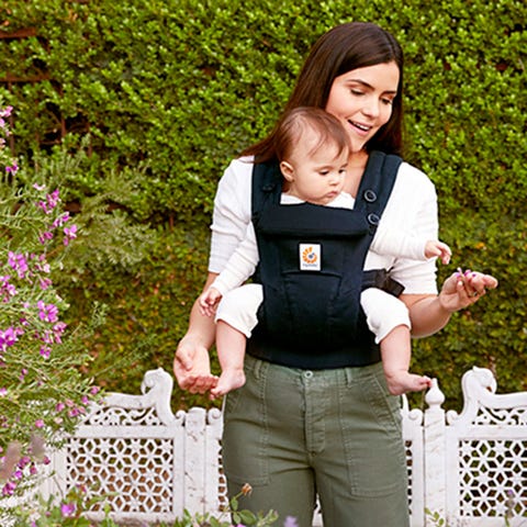 Ergobaby bæresele i grå farge. Designet for komfortabel bæring av barn med justerbare stropper og polstret støtte. Egnet for ulike bæreposisjoner. Noe slitt stoff ved polstring.