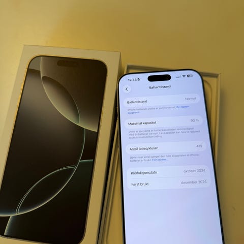 Apple iPhone 16 mobiltelefon med 256 GB lagringskapasitet i blå farge. Enheten har to kameraer på baksiden og usb-C port for lading og tilkobling. Batterihelsen viser 96 % kapasitet med 248 lade-sykluser. Telefonen er produsert i august 2024 og første bruk var i november 2024. Leveres med original ladekabel.