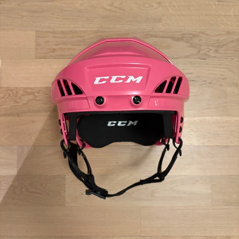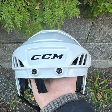 CCM ishockeyhjelm i hvit farge, størrelse 50. Hjelmen er laget for ishockey og har justerbare stropper for sikker passform.