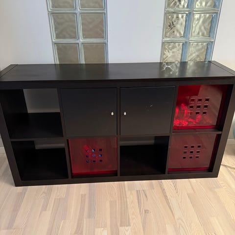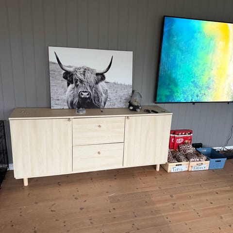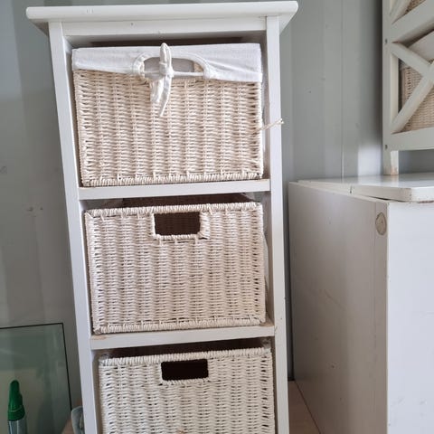 Kommode i bjørkefinish. Ikke heltre, laminat. Funker fint, men har bruksmerker, se nærbilder (inkludert at den hvite malingen har sprukket opp i noen av hjørnene på baksiden av skuffene, se bilder). Har stått lagret tørt i flere år, bare grovvasket på bildet.