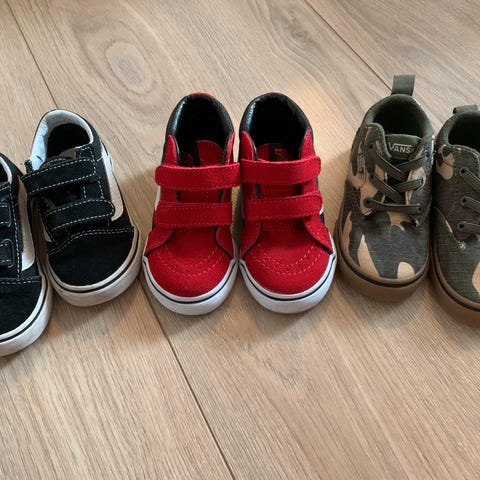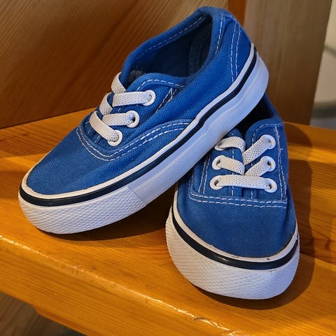 Vans barnesko i størrelse 22, Toddler size 6. designet for unisex bruk. Skoene har blå farge og borrelåsfester for enkel på- og avkledning. Yttersålen har karakteristisk mønster for godt grep.