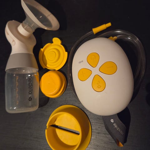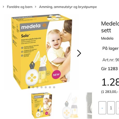 Selger Medela Solo brystpumpe med utstyr. Pumpen er pent og lite brukt, og kommer med to flasker med lokk, lader og bruksanvisning.