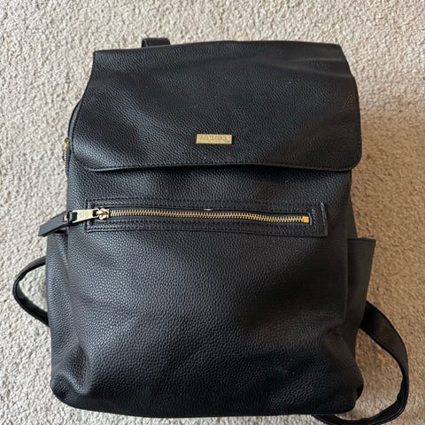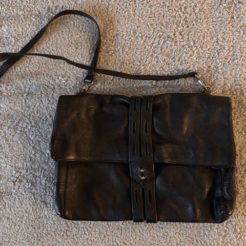 Zara skulderveske for dame laget i svart lær. Vesken har en justerbar skulderrem med beige og svart farge, samt metallbeslag i gullfarge. Den har et åpent hovedrom med plass til personlige eiendeler, og inkluderer en liten avtagbar lomme med glidelås merket med Zara-logo.