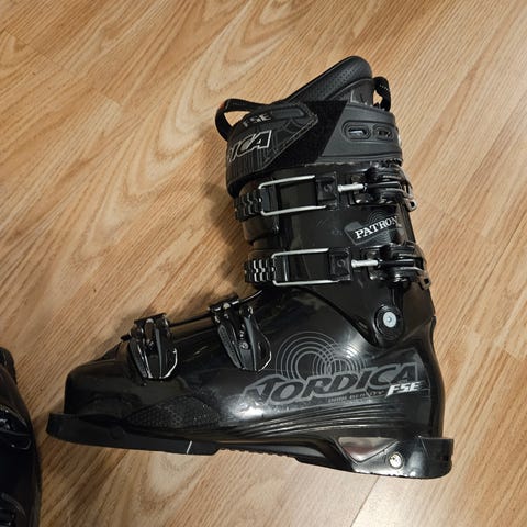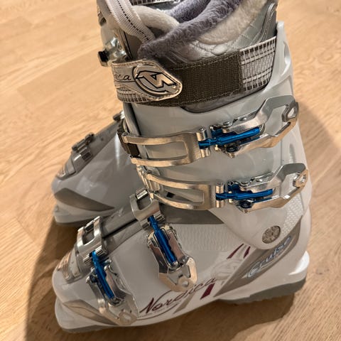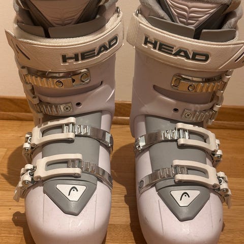 Dalbello skistøvler i størrelse 27,5 med svart, hvit og rød farge. Utstyrt med fire metallspenner for justering og sikker passform. Såle med rød gummiparti.
