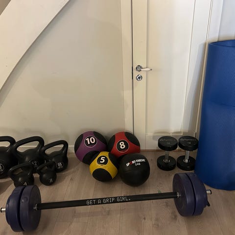 Styrkesett som inkluderer en vektstang med vektskiver, manualer og en treningsbenk. Passer for generell styrketrening og kan brukes til ulike øvelser for hele kroppen.