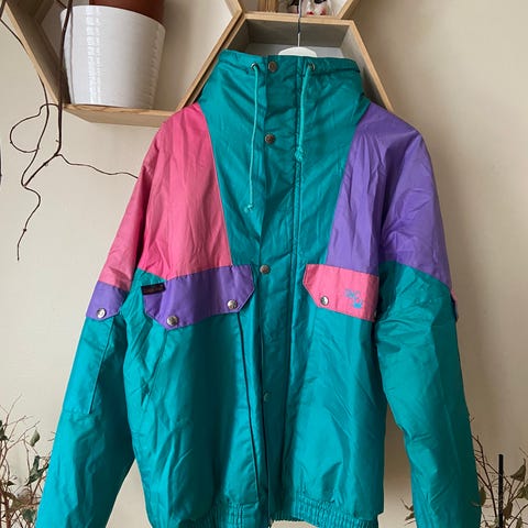 Retro skijakke med lilla for, lite hull i foret ved den ene armen. Perfekt til firmatur, utdrikningslag eller å dominere Trysilfjellet.