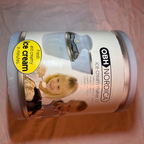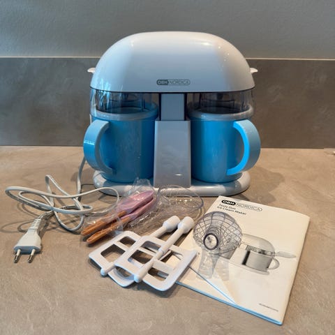 En elektrisk iskremmaskin med dobbel beholder. Kan leveres til Orkanger etter avtale/ved mine shoppingturer, eller sendes mot betaling av frakt. Lager god is - når man husker at maskinen står i skapet 🙂 Det finnes bruksanvisningen