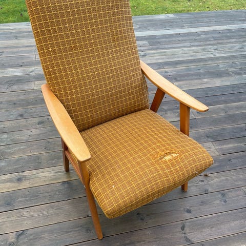 Eldre retro lenestol selges. I god stand, noe slitasje på ben og armlener. Grønt boucle-lignende tekstil med mørke armlener.