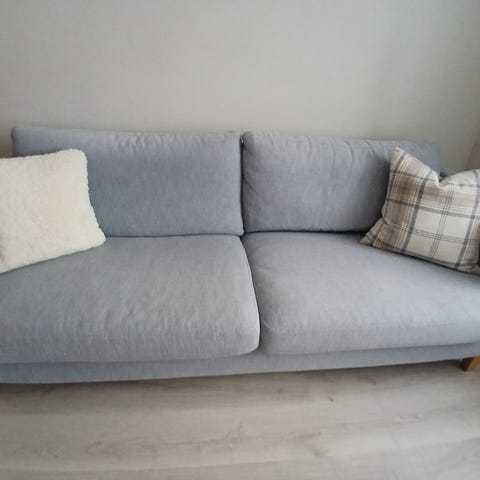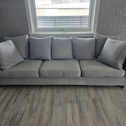 Les nøye!! Stor og robust 3 seter sofa selges. Den må hentes og bæres og demontres ene siden for og få ut. Og trekket under sofa er tatt bort. Men det har ingen betydning for sofaen og syntes ikke. Har bare hatt sofaen i ca 7 måneder og utrolig god å sitte og ligge i. Får mye for pengene her. Les nøye!!