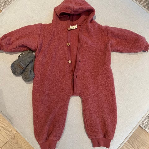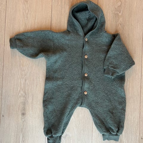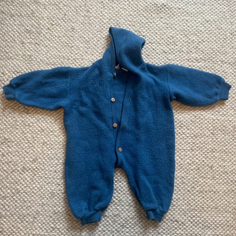 Nøstebarn ulldress i størrelse 80/86. Den er nok litt krypet i vask, så nærmere 80 enn 86. Dressen er blå og laget av100% ull.