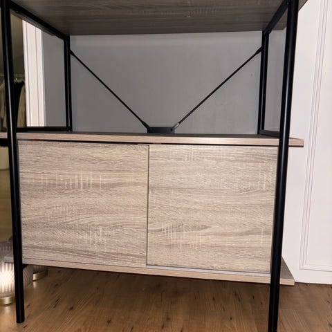 Den har 3 hyller. Den midterste hyllen er av glass,