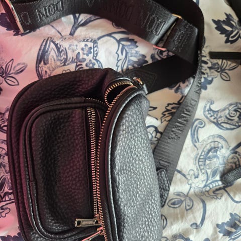 Selger denne kjekke, fine veska. Fargen er sort og beige.