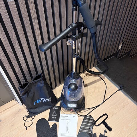 Dampstrykejern i blå og hvit farge. Utstyrt med standard strømkabel og strømkontakt. Passer til daglig bruk for stryking av klær.