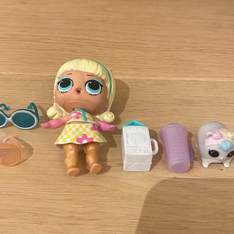 L.O.L. Surprise dukker med tilbehør inkludert solbriller, drikkeflaske, kopp og armbånd. Dukker i ulike farger og klær, beregnet for barn.