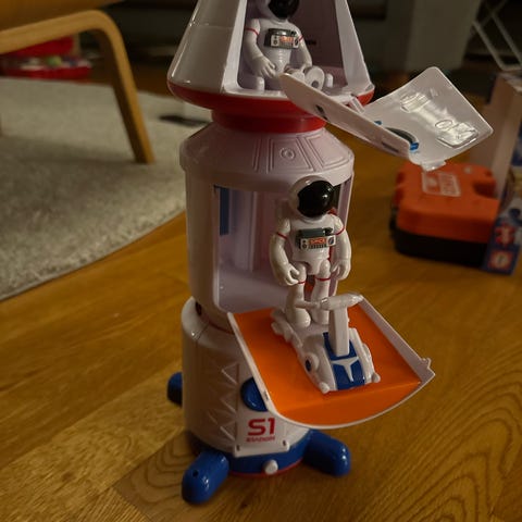 Byggesett og bok om romraketter og verdensrommet på engelsk. Instruksjoner følger med. Byggesettets instruksjoner og bok er på engelsk, da settet opprinnelig er kjøpt i Storbritannia. Settet kan settes sammen og tas fra hverandre uten lim, saks e.l.
