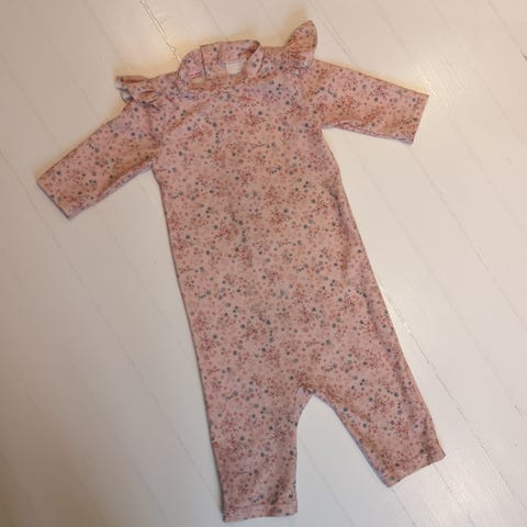 Uvdrakt / badetøy fra Newbie i størrelse 98/104. Brukt samtidig som klær i 92/98. Bruksmerker (nuppete). Motiver med blomster.