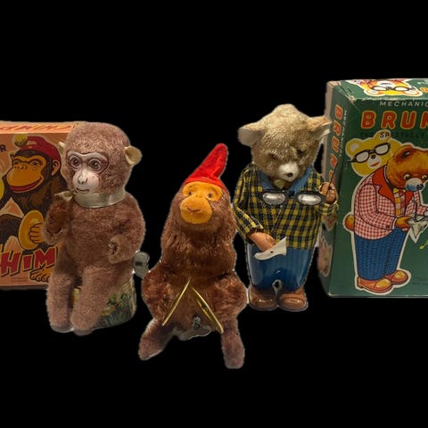 Vintage mekanisk leketøy bestående av en ape og en gås. Apens kropp er laget av plysj med en mekanisk nøkkel på siden, og den står på en dekorert base. Gåsen har en fargerik kropp med blå, hvit og rød farge. Begge figurene er designet som samleobjekter eller dekorative leketøy.