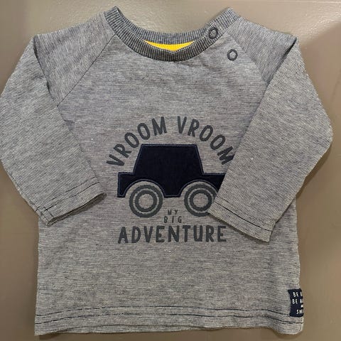 Fin liten genser til baby. Str 80 - 9-12 mnd. ubrukt med lapp . Mørk blå med dino trykk og liten lomme.