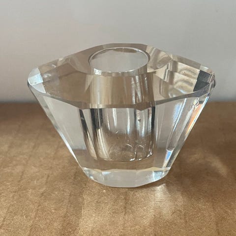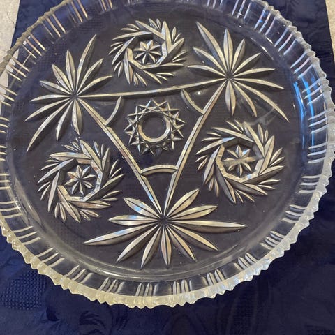 Kakefat laget i glass med innskjærte mønstre. Fatet har detaljerte geometriske og florale motiver. Fatet har 3 små føtter og er ganske tungt som krystall. Men kjenner ikke til merket