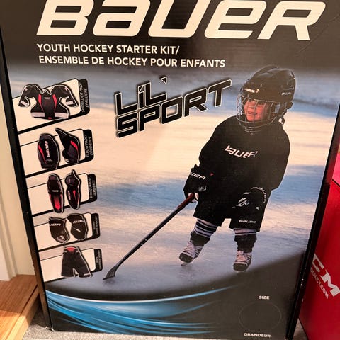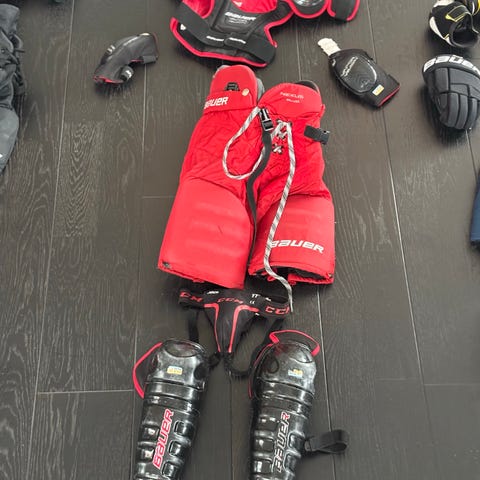 Settet inkluderer hjelm (Reebook str. S), skulderbeskyttelse (str Yth/M), albuebeskyttelse, leggskinn, hansker, gamasjer, hals- og nakkebeskytter, bukse(str. Yth/M), skøyter (str. 34) og bag. Passer til barn 5-7 år. Selges samlet