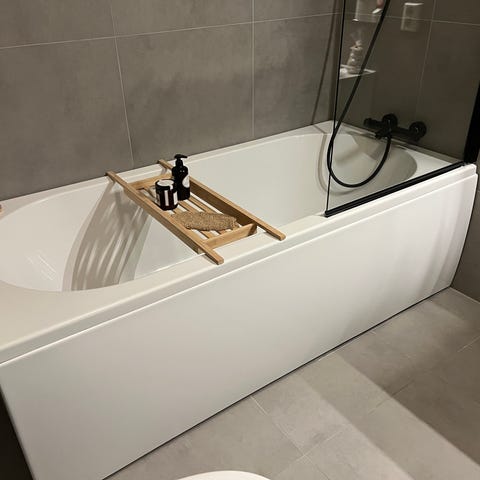 Badekar i hvitt med integrert armatur og hånddusj. Rektangulært design med avrundede kanter. Overflate i glatt materiale som er lett å rengjøre.