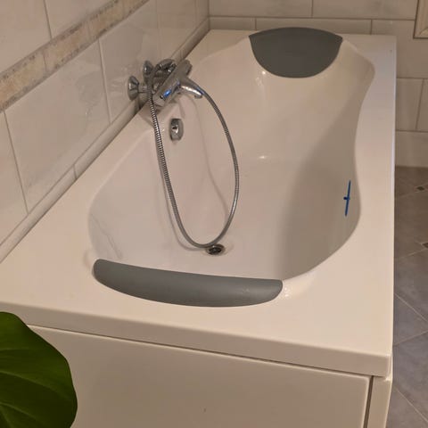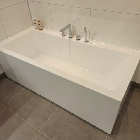 Badekar i hvitt med armatur og hånddusj