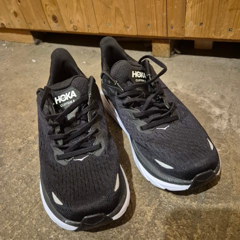 Hoka Clifton 8 joggesko i størrelse 42. Designet for løping og hverdagsbruk med dempet såle for komfort.