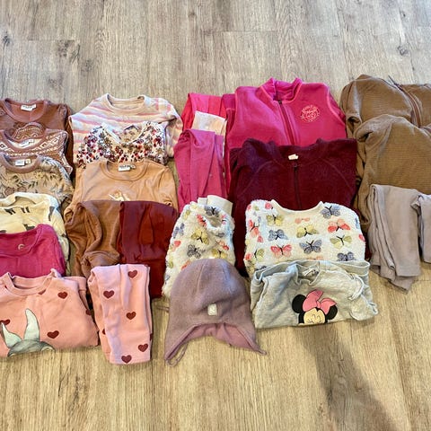 Klespakke jente str 86. Inkluderer fleesjakke, ull, T-skjorter, body/genser, bukser, nattdrakt, utkledningskostyme, ull, uv-drakt, strømpebukser etc