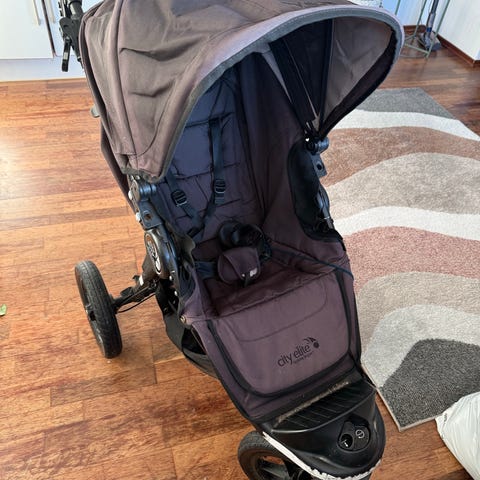 Baby Jogger City Elite sportsvogn med tre hjul, justerbart solskjerm, og polstret sete. Designet for enkel manøvrering og komfort for barnet.