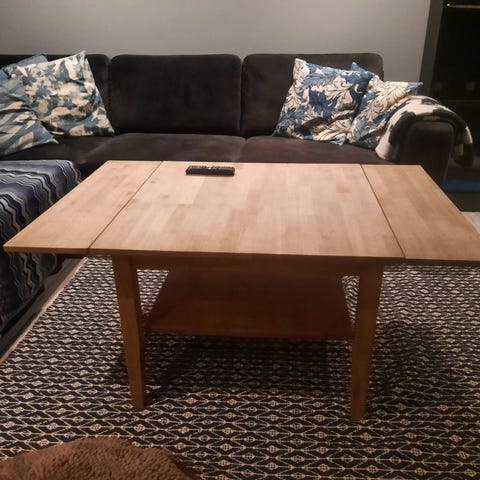 Fint eik salongbord med hylle selges. Bordet ble kjøpt for mange tusen kr for mange år siden og er solid. Str 74 x 129,5. Høyde 52,5. Selges grunnet flytting. Må hentes på Lørenskog. Se bilder for 2 små hakk på den ene siden. Åpen for bud.
