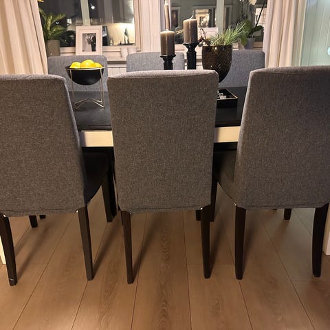 Stoffet under trekket (på selve stolen) smuldrer litt, så det er kun det ene trekket som er vasket. Burde uansett kjøpe nye trekk.