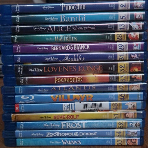Blu-ray samling med Disney klassiskere inkludert titler som Dumbo, Bambi, Pinocchio, Fantasia, The Jungle Book, Aladdin, The Lion King, Pocahontas, og mange flere. Samlingen består stort sett av filmer i Blu-ray format. 8 av filmene er i DVD format. Filmene er egnet for familie- og barneunderholdning. 19 av Blu-Ray filmene er uåpnet i plast. Resten av Blu-Ray filmene er sett 1 eller 2 ganger. DVD filmene er også i god stand.