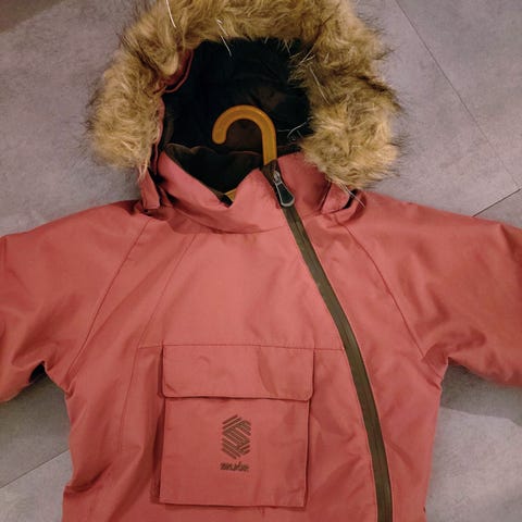 Av sikkerhetshensyn er hetten festet med trykknapper og kommer med avtagbar, syntetisk pels. En lang glidelås i front gjør det enkelt å ta dressen av og på, også for små, utålmodige hender.