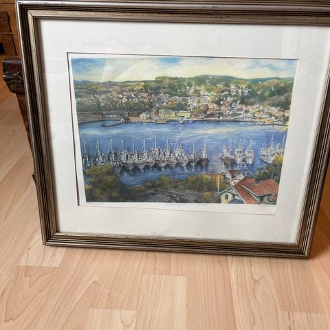 Ukjent kunstverk i akvarell som forestiller båter i havet. Bildet er innrammet med passepartout og glass. Rammesenteret AS har stått for innrammingen, og det finnes en stempelmerke på baksiden med informasjon om garanti og rammesenteret. Bildet har en signatur, men kunstnerens navn er ikke tydelig. Størrelse 47x60 utv målt. Nydelig med affeksjonsverdi