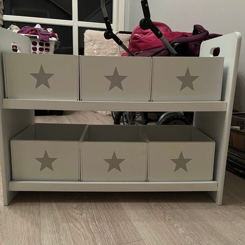 Jollyroom barnerom møbel i form av en hylle med flere rom og skapdører. Møbelet er hvitt og egnet for oppbevaring og organisering i barnerom.