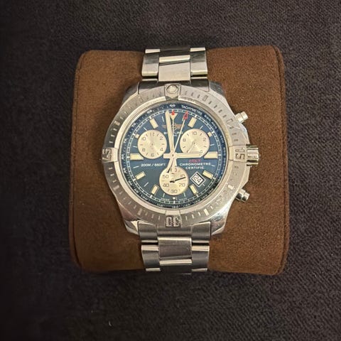 Meget pen Breitling Colt Ocean i svært ryddig stand, med fin kasse og lenke, helt jevn og frisk lume og ingen sjenerende riper. Klokken gir et solid og ordentlig inntrykk på håndleddet, akkurat slik en Breitling skal.