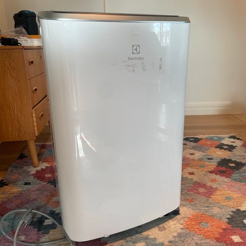 Canvac aircondition med kontrollpanel for innstillinger. Enheten har tilkoblingsslange og er designet for innendørs bruk. Farge: hvit. Strømkabel inkludert.