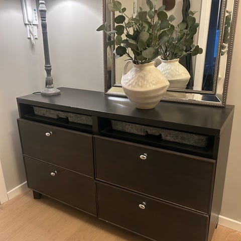 Pent brukt som TV-skjenk. 3 store skuffer til oppbevaring. Den har et lite merke på overflaten, se bilde 2, men det er ikke noe man tenker over.