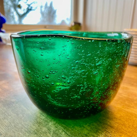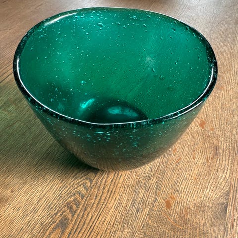 Lekkert fat i dypgrønt, munnblåst glass med innlagte luftbobler fra Hadeland Glassverk.