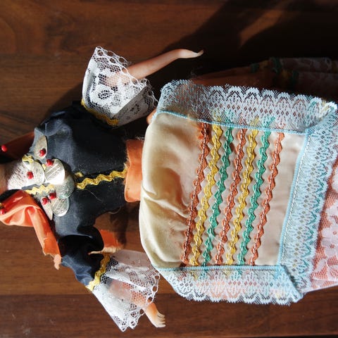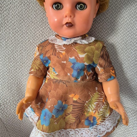 Pen Pusle dukke med mørkt langt hår. Friske fine farger i ansiktet. Pene klær. Stram og fin i kroppen.. Har nok vært klipt opp litt i håret men det ser pent gjort