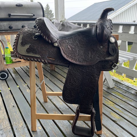 Selen er pen, i kraftig og solid lær. Det er satt på hurtigfester på bakselestroppene. Den har 3 festepunkter på hver side. Den har et spesielt nedsenket bryststykke, som sikrer strupefrihet (emptahy?). Usikker på merke, men ligner en Diplomat.