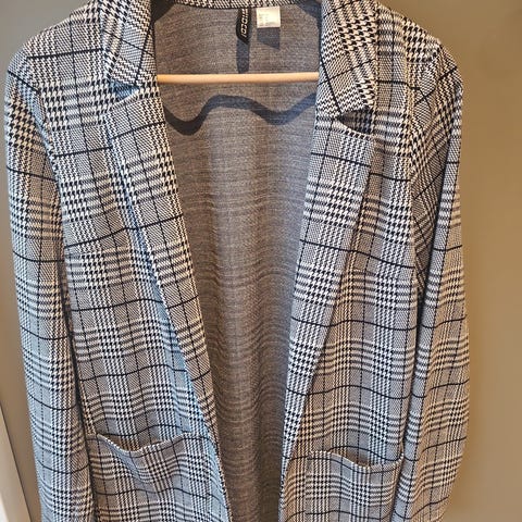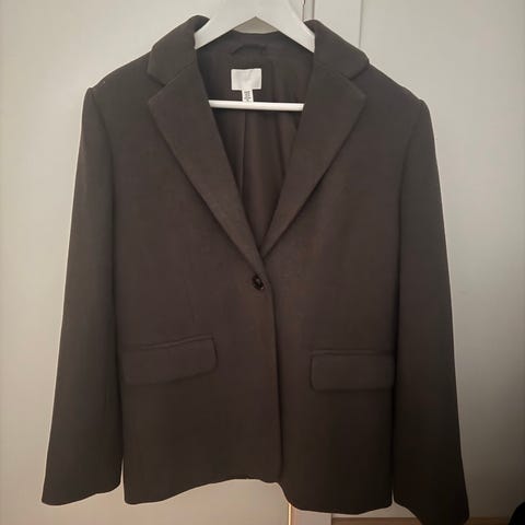 Veldig pent brukt H&M blazer i beige farge, størrelse XS. Fint spill i stoffet og flatterende snitt. Laget av polyester materiale. Designet for kvinner. Kan sendes raskt.