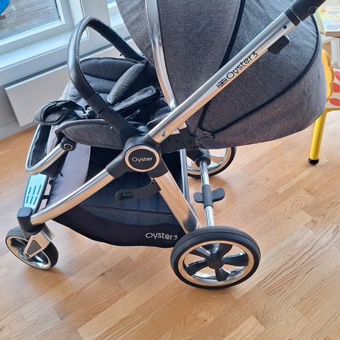 Emmaljunga barnevogn i rød farge med fire store hjul og justerbart håndtak. Vognen har sele for sikkerhet og oppbevaringskurv under setet. Egnet for barn.
