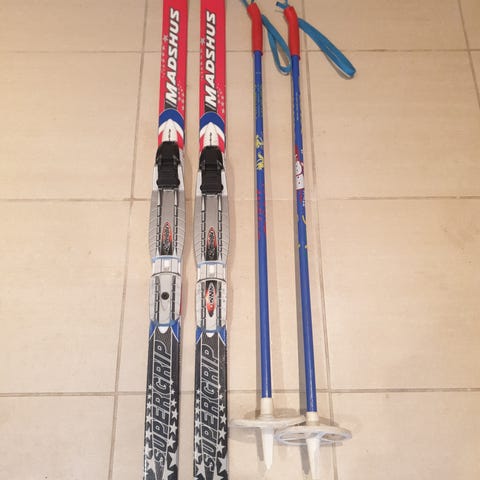 Madshus Racelight smørefrie langrennsski 117 cm lange. Langrennsstaver Swix 95 cm lange.