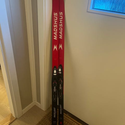 Langrennsski Madshus Racelight smørefrie 117 cm og langrennsstaver Swix 95 cm.
