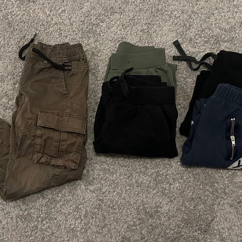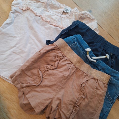 Selger en pakke med fire bukser i str 98. Pakken inneholder 3 beige bukser og en grønn bukse fra Hust and Clair. Lite til aldri brukt.