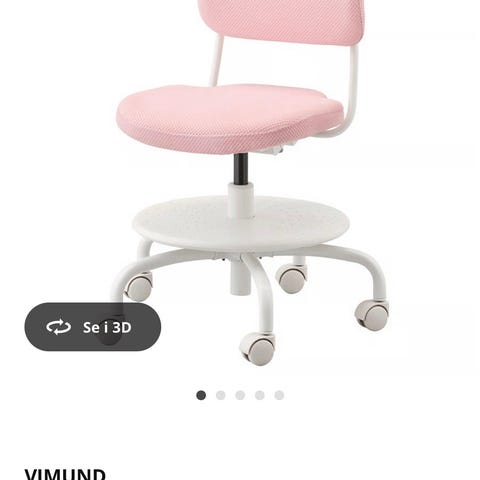 IKEA VIMUND barnestol i lys rosa farge. Stolen har et polstret sete og ryggstøtte med et pustende stoff. Den har hjul for enkel bevegelse og justerbar høyde. Designet for barn og egnet til bruk ved skrivebord.